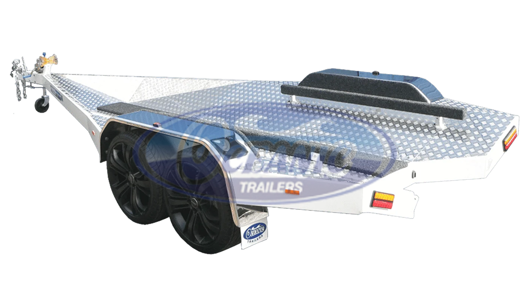 Another stunning custom ski boat trailer from Oceanic, featuring a gloss 2-pac white finish, full polished checker plate deck, polished alloy wheel guards and blacked-out alloy rims.